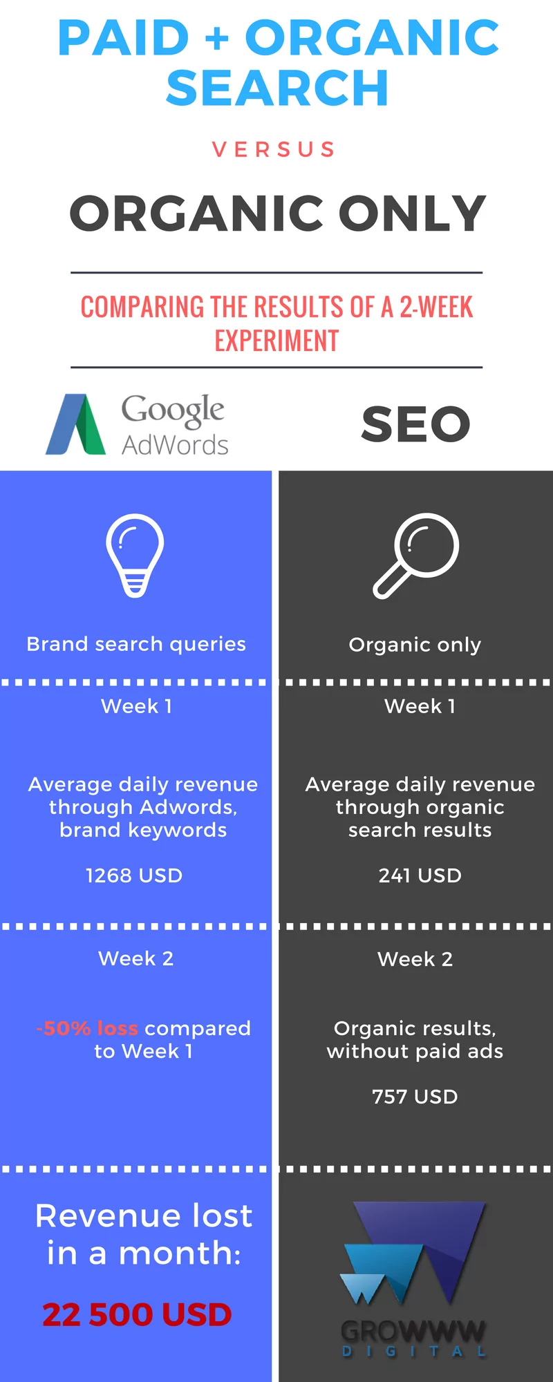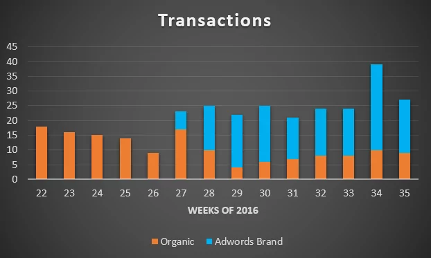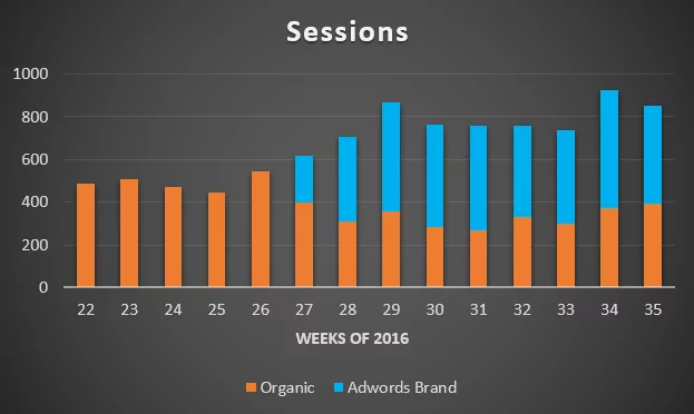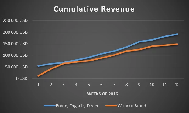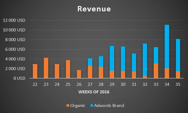 Simply put, organic search results could not make up for the drastic decrease. Without brand ads in Adwords, a loss of $750 daily means 50% less revenue. We consider that a lot.